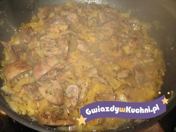 Cynaderki wymoczyć przez kilka godzin, często zmieniając wodę, oprawić, pokroić w kawałki. Na patelni podsmażyć rozdrobnioną cebulkę, dodać cynaderki i dusić pod przykryciem pół godz. Dodać przyprawy i jabłko pokrojone w dużą kostkę, dusić kolejne 15 min.