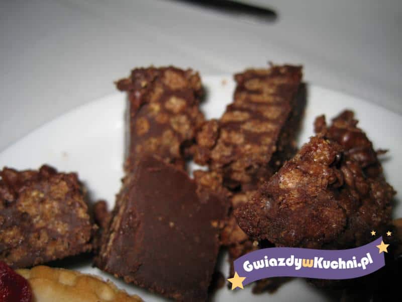 Gotujemy wodę, masło oraz cukier. Po ugotowaniu odstawiamy na chwilę do wystudzenia, następnie dodajemy mleko w proszku, kakao oraz bakalie. Wszystko razem bardzo dokładnie mieszamy i wylewamy na prostokątną blachę. Blachę z masą odstawiamy w chłodne miejsce, żeby dobrze czekolada zastygła, następnie kroimy czekoladę dowolnie.