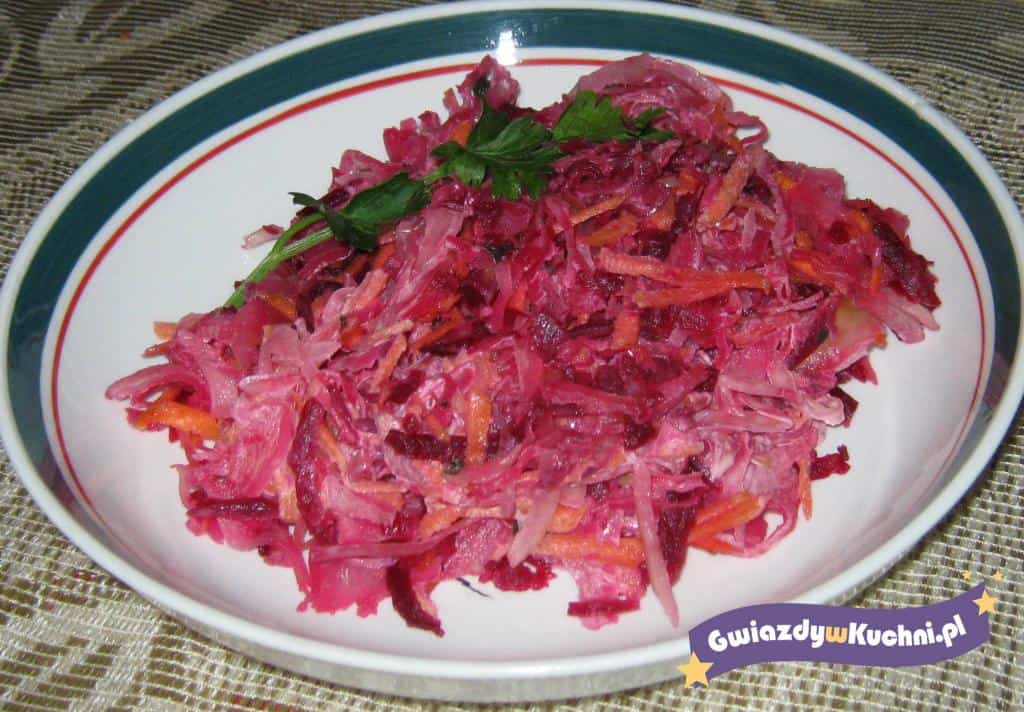 Kapustę odcisnąć, marchew obrać, umyć i zetrzeć na dużych oczkach tarki. Buraka obrać i też zetrzeć na tarce. Cebulę obrać i drobno pokroić. Do kapusty dodać cebulę, marchew i startego buraczka. Wymieszać, doprawić do smaku i skropić olejem. Podawać jako dodatek do obiadu.