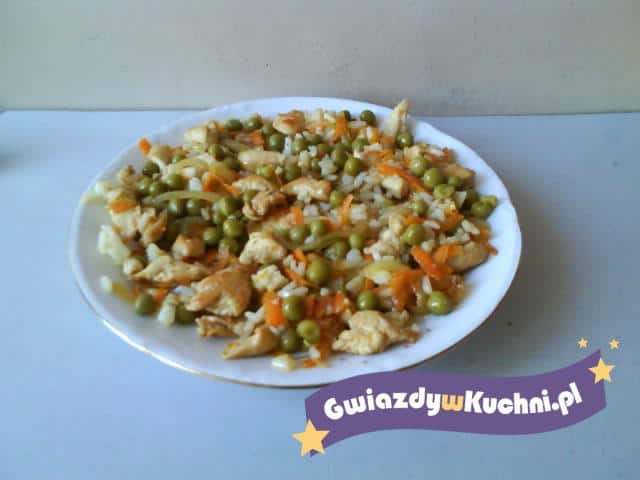 Pierś z kurczaka pokroić w paseczki. Cebulę obrać i pokroić w piórka. Marchewkę oskrobać, umyć i zetrzeć na tarce o grubych oczkach. Na patelni rozgrzać olej, podsmażyć cebulę i mięso, dodać marchewkę, doprawić pieprzem i solą. Wszystko zalać niewielką ilością wody i dusić 20 min. Dodać osączony groszek i ryż, wymieszać. Całość dusić jeszcze chwilę.