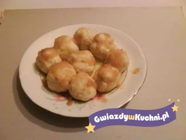 Ser rozgnieść widelcem, dodać kaszę manną, żółtka, cukier puder, szczyptę soli i dokładnie wymieszać. Białka ubić na sztywną pianę, dodać do masy serowej i wymieszać. Z masy formować kulki, wrzucać do wrzącej osolonej wody i gotować 6 min. Wyjąć na talerz. Masło stopić, wsypać bułkę tartą, podsmażyć. Polać gotowe danie.