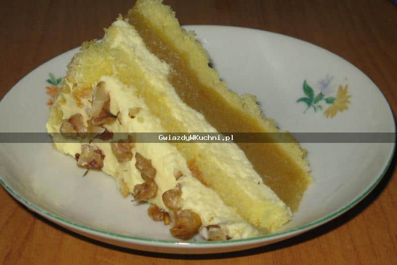 Biszkopt przekroić wzdłuż. Pierwszy blat biszkoptu dowolnie nasączyć i nałożyć tężejącą masę jabłkową. Na to nałożyć ¾ masy karpatkowej i przykryć drugim blatem biszkoptu. Wierzch udekorować pozostałą masą i posypać orzechami
