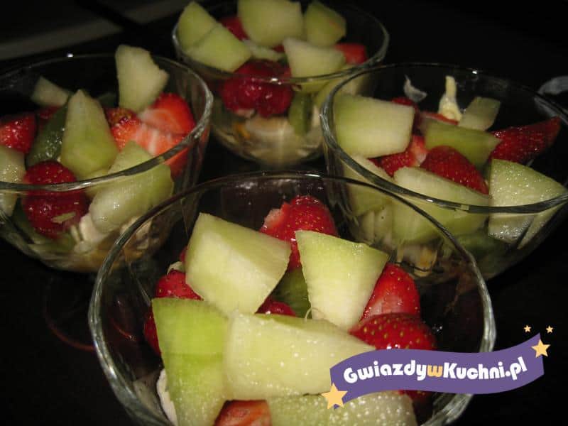 Śmietanę ubijamy na sztywno. W oddzielnym naczyniu ubijamy jajko później dodajemy cukier i jeszcze chwile ubijamy do białości. Śmietanę ubita 30% łączymy z ubitymi jajkami i mieszamy delikatnie łyżką. Wkładamy do zamrażalnika na około 5 godzin. Po tym czasie nakładamy łyżką lody do pucharków i dodajemy pokrojone owoce: kiwi, melona i truskawki. Można dodać inne na jakie jest sezon.