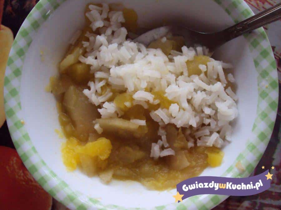 Dynię, jabłka myjemy, obieramy, kroimy, gotujemy w garnuszku 5 minut. Ryż odgotowujemy w wodzie 10 minut. Odgotowany ryż mieszamy z cynamonem, dodajemy ugotowany mus. Smacznego.