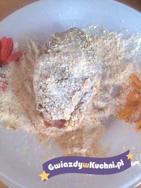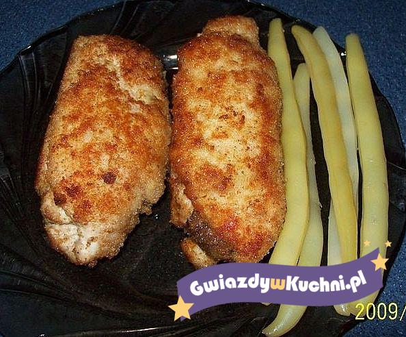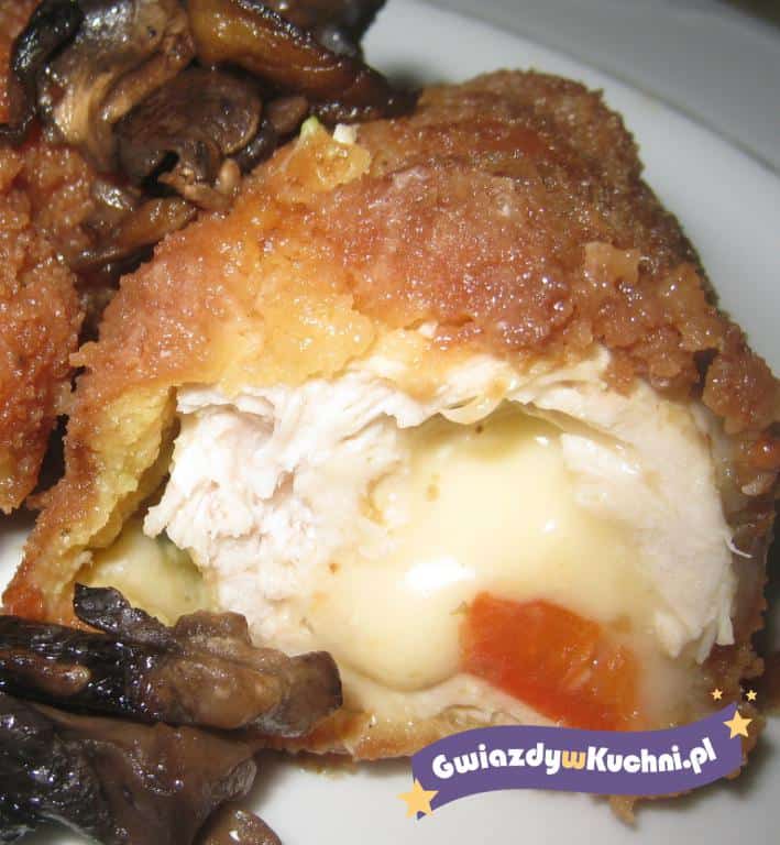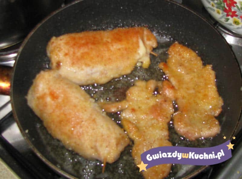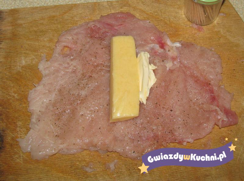Piersi rozbić osolić i popieprzyć. Na piersi ułożyć odrobinę masła i ser żółty. Zwinąć w roladkę. Obtoczyć w jajku i w bułce.