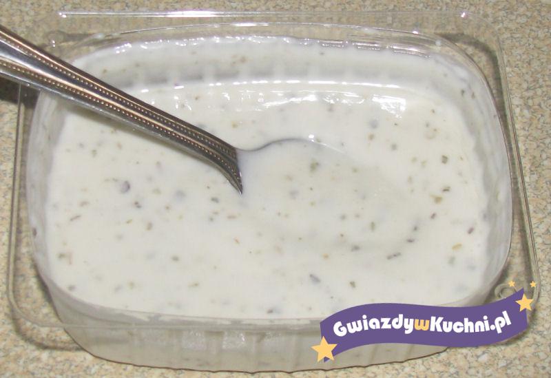 Majonez należy przełożyć do miseczki, wymieszać dokładnie z jogurtem, sokiem z cytryny. Dodać do niego zmiażdżony czosnek, tymianek, wymieszać i doprawić do smaku solą oraz pieprzem cayenne.