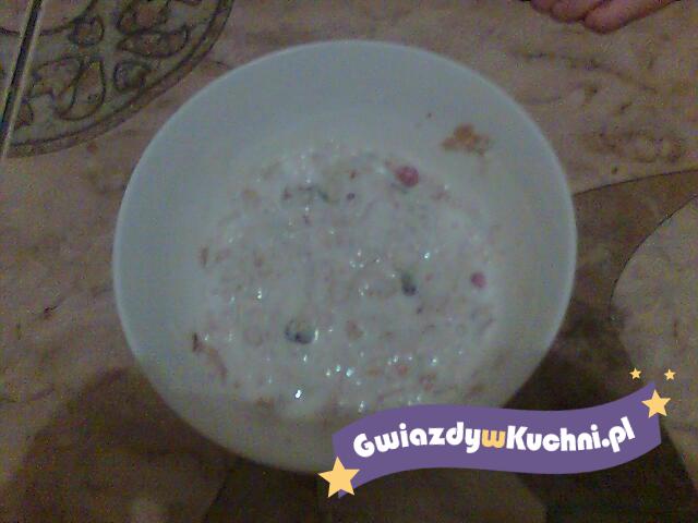 Jogurt łączymy z rodzynkami i drobno pokrojonymi suszonymi figami. Do talerza wsypujemy płatki i polewamy je jogurtem.