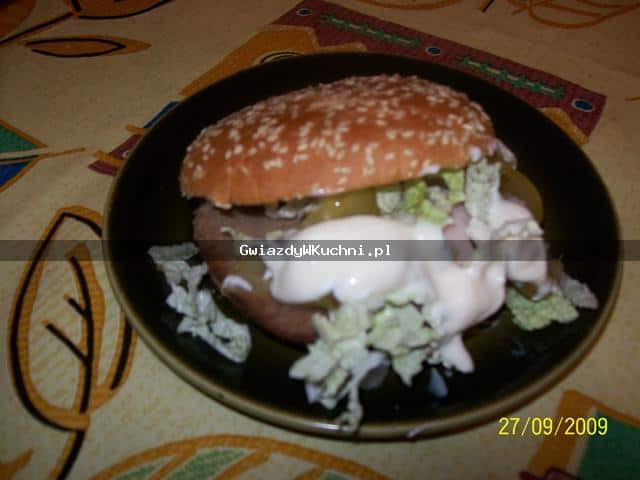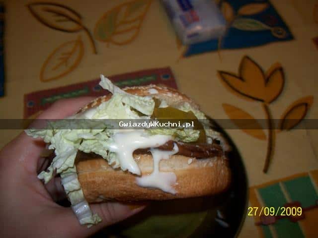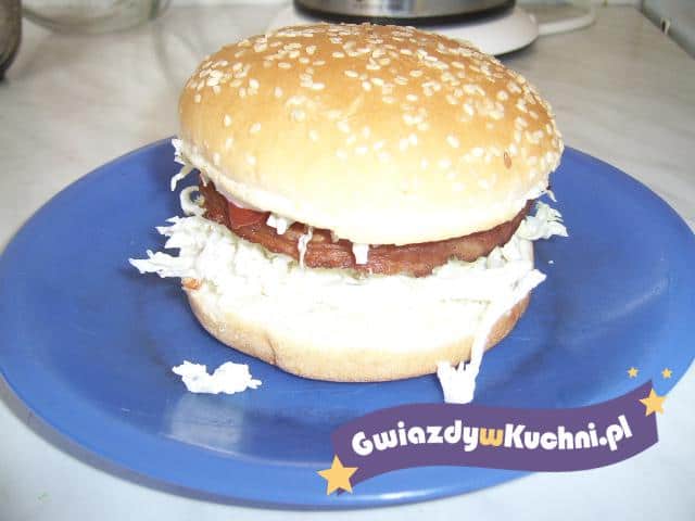 Bułki przekrawamy na pół, wkładamy do każdego po jednym steku, całość wkładamy do piekarnika, żeby się dobrze podgrzało. Następnie do środka każdego z hamburgera wkładamy kukurydzę, ogórki pokrojone w plasterki oraz poszatkowaną kapustę pekińską. Na całość kładziemy po 2 łyżeczki majonezu.