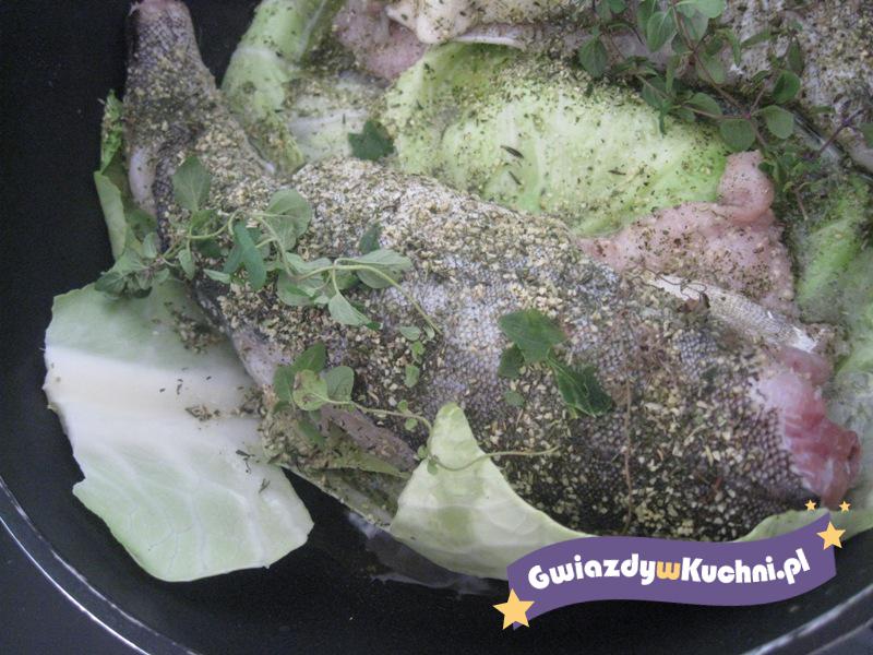 Dorsza i oczyszczamy z ości i płetw, myjemy dokłądnie, skrapiamy sokiem z cytryny, posypujemy przyprawą do ryb i pokrojonym czosnkiem. Pozostawiamy na 2 godziny. Na wysokiej patelni kłądziemy na dno liście kapusty, zalewamy oliwą z oliwek i przekłądamy rybę. Dusimy rybę z obu stron na małym ogniu, przyprawiamy solą i pieprzem i kładziemy na wierzch ryby gałazki oregano. Uważamy żeby ryba sie nie rozgotowała. Podajemy do obiadu.