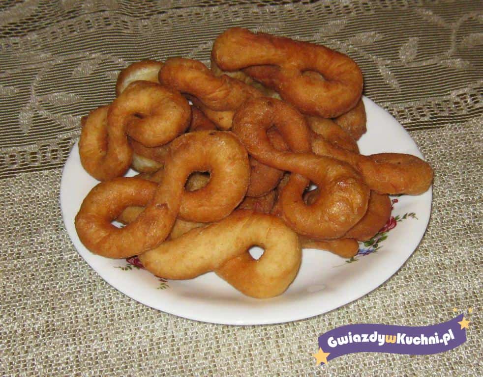 W pół szklance mleka rozmieszać drożdże z łyżką cukru i łyżką mąki. Odstawić w ciepłe miejsce. Gdy drożdże zaczną rosnąć dodać je do mąki. Dodać jajka z roztrzepaną resztą cukru, dodać mleko, trzy łyżki oleju, zarobić ciasto. Odstawić do wyrośnięcia w ciepłe miejsce. Na stolnicę posypać trochę mąki, wyłożyć ciasto, rozwałkować i szklanką wykrawać kółka. W środku kółek wycinać dziurki kieliszkiem. W rondlu rozgrzać olej. Skręcać precelki i wrzucać na gorący tłuszcz. Smażyć krótko do zrumienienia. Osączyć z nadmiaru tłuszczu, posypać cukrem pudrem.