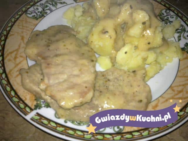 Kotlety lekko rozbić pięścią, posolić, popieprzyć i podsmażyć na rumiany kolor. Mięso przełożyć na talerz. Na patelnię z rozgrzaną oliwą wrzucić mąkę i zrumienić dodać musztardę rozcieńczoną z wodą. Gotować przez chwilę, doprawić do smaku przyprawami i dodać kotlety aby się podgrzały. Podajemy z ziemniakami.