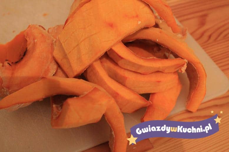 Dynię obrać, rozdrobnić, posolić, przełożyć na blaszkę. Piec 20 min w 200 st.