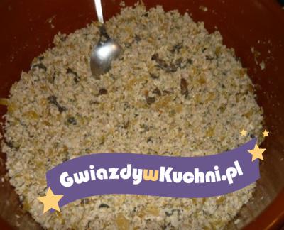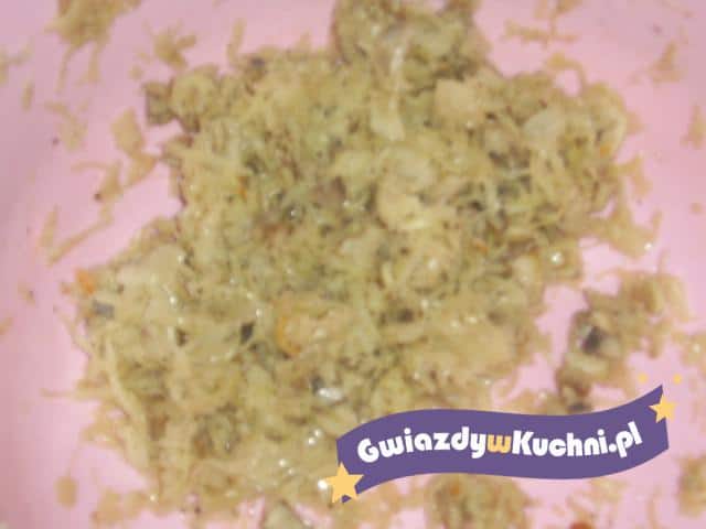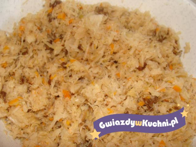Grzybki moczymy na noc, rano odcedzamy kroimy i podsmażamy z pokrojoną cebulką. Na sam koniec dodajemy sól i pieprz, kapustę.