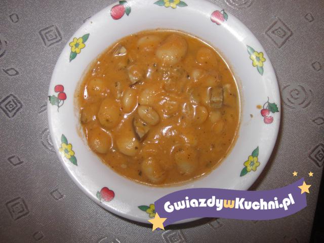 Cebulę obrać. Fasolę wypłukać, zalać 2 litrami gorącej wody. Odstawić na 2-3 godziny. Fasola szybciej napęcznieje. Następnie wlać do garnka z wodą w której się moczyła, dodać cebulę oraz liść laurowy. Gotujemy fasolę do miękkości. Pod koniec gotowania fasolę posolić do smaku. W między czasie boczek pokroić w kostkę. Kiełbasę obrać z osłonki, pokroić w kostkę. Boczek i kiełbasę włożyć na patelnię i podsmażyć. Na 15 minut przed końcem gotowania fasoli dodać przyprawę do dań z fasoli oraz koncentrat pomidorowy. Następnie dodać kiełbasę z boczkiem. Wsypać majeranek, wymieszać. Gotować 15 minut. Doprawić jeszcze fasolę do smaku solą oraz pieprzem. Rozgrzać 4 łyżki oleju, wsypać mąkę zrobić zasmażkę. Następnie zasmażkę rozprowadzić w zupie. Jeszcze chwilę gotować. Danie gotowe.