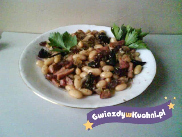 Cebulę obrać i posiekać w kostkę. Śliwki pokroić na kawałki. Kiełbasę pokroić w paski. Na rozgrzanym oleju smażyć cebulę z kiełbasą, dodać pokrojone śliwki i rodzynki. Wlać bulion, doprawić pieprzem i solą. Włożyć fasolę i miód. Wszystko wymieszać, przykryć i dusić 20 min. Wyłożyć na talerz i udekorować listkami selera.