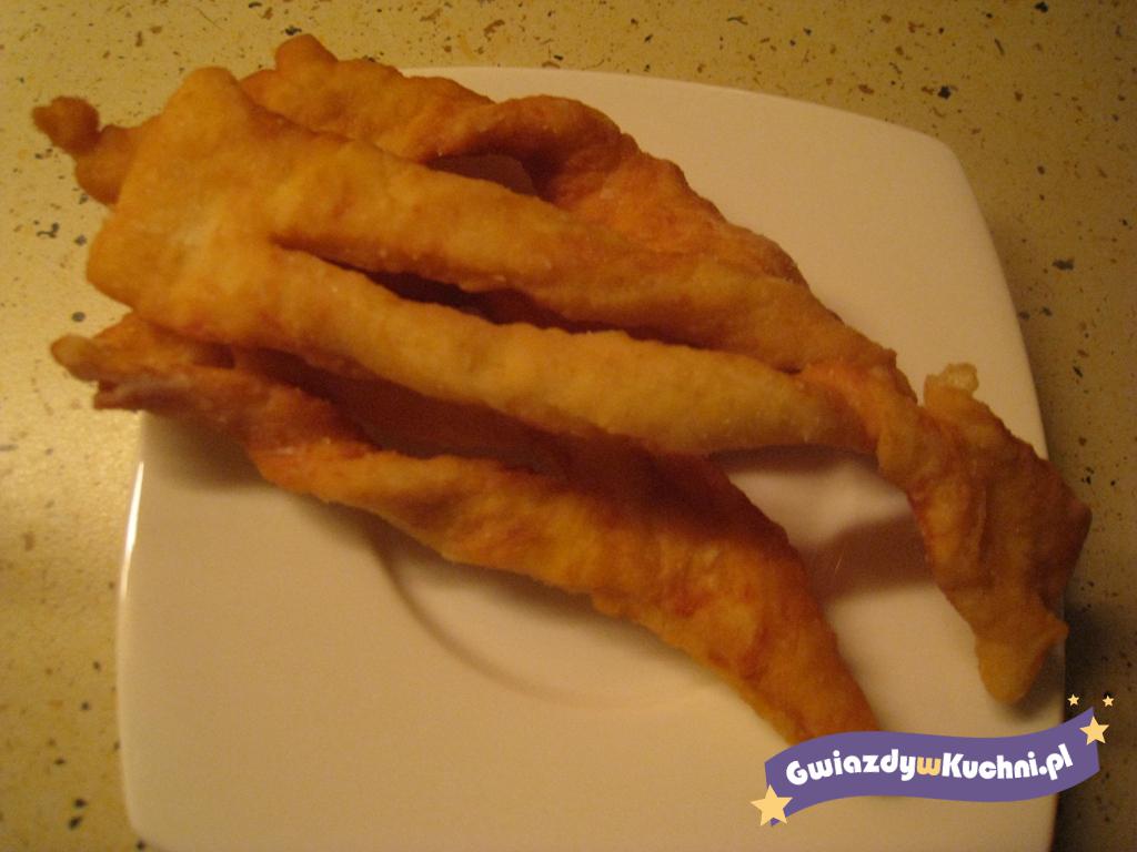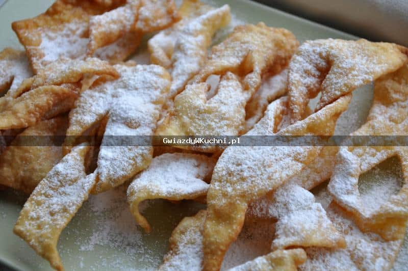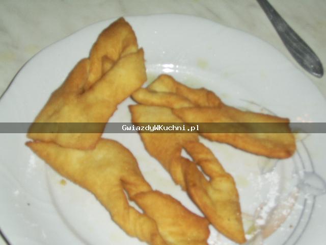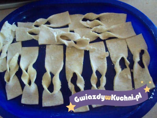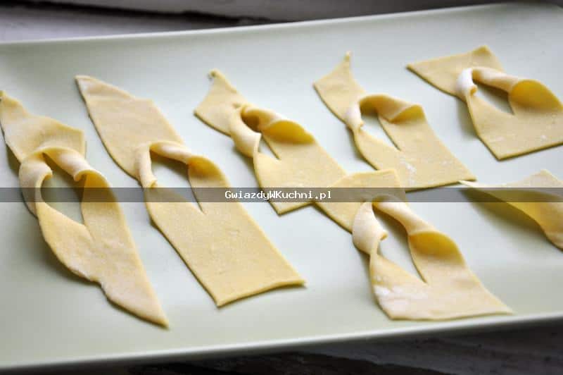 Z przesianej mąki, żółtek, śmietany, cukru i octu zagniatamy zwarte ciasto. Wybijamy wałkiem, aby się dokładnie napowietrzyło. Pozostawiamy w lodówce na około godzinę. Następnie cienko wałkujemy i kroimy na pasy długości 10-12 cm. Nacinamy w środku i przekładamy jeden koniec przez środek.