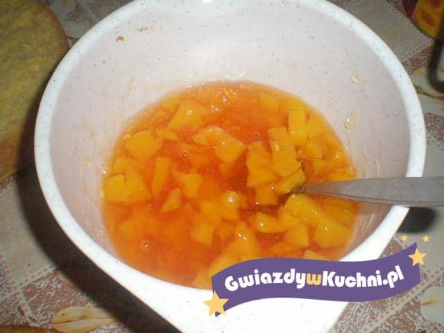 Galaretki rozpuścić we wrzątku. Żelatynę rozpuścić w kilku łyżkach wody i połączyć z galaretką, wymieszać. Brzoskwinie wyjąć z z zalewy, pokroić w kostkę i dodać do delikatnie tężejącej galaretki. Wymieszać. Galaretkę z owocami wykładać na ciasto, gdy zacznie już tężeć- tak, jak na zdjęciu.