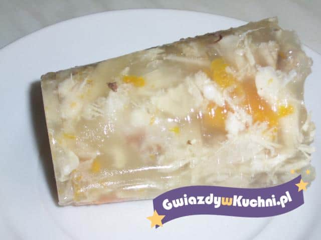 Nóżki oczyszczone, umyć dokładnie, przerąbać, zalać zimną wodą i gotować. Włoszczyznę umyć, dodać do nóżek, osolić i gotować do miękkości. Pod koniec gotowania dodać zmiażdżone przyprawy i liść laurowy. Nóżki ostudzić, mięso obrać z kości i pokrajać w kostkę. Warzywa pokrajać w cienkie paski. Połączyć mięso z warzywami i zagotować razem z rosołem. Dodać czosnek roztarty z solą. Po przestudzeniu wlać do formy.