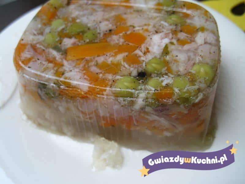 Mięso dokładnie myjemy w wodzie, namaczamy na 2 godziny, wodę wylewamy, nalewamy świeżą, gotujemy na małym ogniu pod przykryciem. Dodajemy włoszczyznę, wegetę i dalej gotujemy. Łyżką wyjmujemy z wierzchu rosołu nieczystości i dalej gotujemy mięso do miękkości. Należy rosół doprawić do smaku pieprzem i solą. Warzywa i mięso wyjmujemy a rosół dalej gotujemy na cały czas małym ogniu. Przygotowujemy żelatynę: do suchego naczynia wsypujemy żelatynę i wlewamy zimną wodę aby przykryła ją. Następnie wlewamy 1 szklankę gorącego rosołu i mieszamy dopóki nie będzie grudek, wlewamy miksturę do rosołu, mieszamy. Pokrojone i obrane z kości mięso dodajemy do rosołu z żelatyną, mieszamy. Do małych miseczek wkładamy pokrojoną włoszczyznę i groszek konserwowy, następnie przelewamy mięso z rosołem. Odstawiamy do zsiądnięcia w lodówce