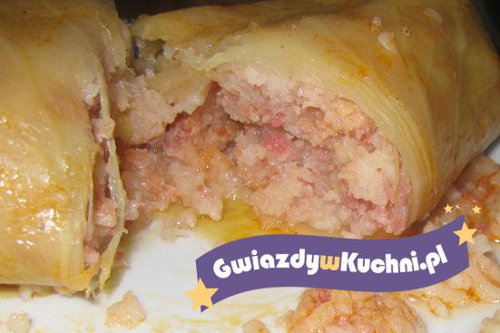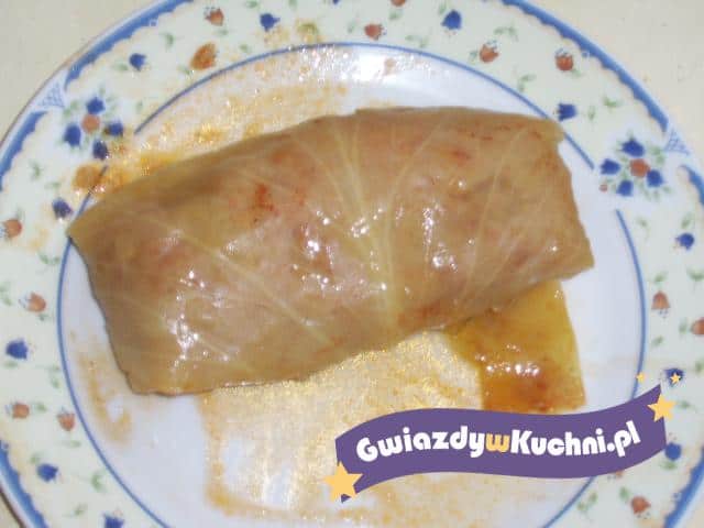 Na liściach z kapusty nakładać nadzienie, zawijać gołąbki, włożyć do rondla, zalać wodą i dusić do miękkości.