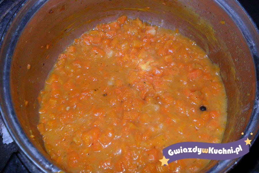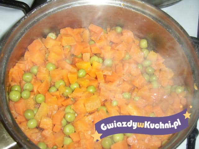 Marchewkę obieramy, kroimy w kostkę, gotujemy w garnuszku. Gdy marchew zmięknie to dodajemy cukier, sól i pieprz do smaku, mieszamy. Następnie dodajemy masło, mąkę rozrobioną w 1/2 szklanki wody, zagotowujemy. Na koniec dodajemy odcedzony groszek.