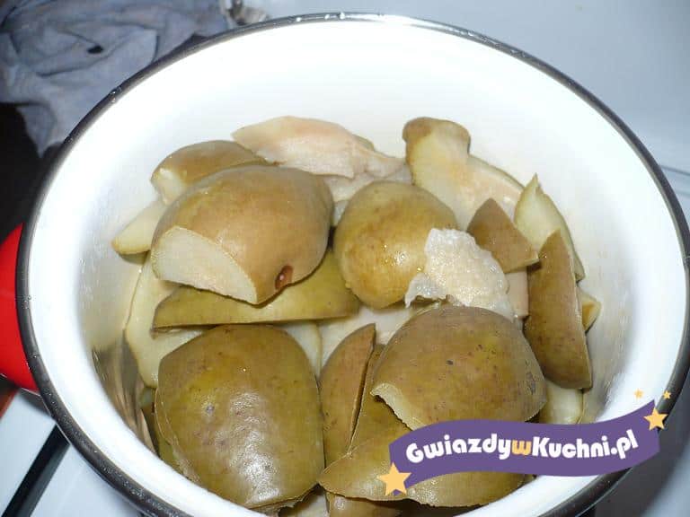 Gruszki dokładnie umyć i pokroić na ćwiartki. Do garnka wlać wodę i zagotować. Gdy woda się zagotuje wrzucić gruszki. Wycisnąć sok z cytryny i dodać do gotujących się gruszek. Wsypać cukier i jedną łyżeczkę cynamonu. Wszystko podgotować do momentu gdy gruszki będą miękkie. Po ugotowaniu odlać wywar i przełożyć ugotowane gruszki do talerzyka.