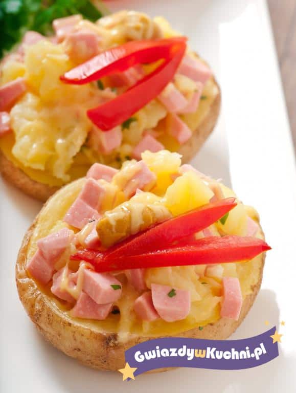 Ziemniaki myjemy (nie obieramy), osuszamy i smarujemy oliwą, nacieramy solą i pieprzem. Następnie zawijamy w folię aluminiową i grillujemy na rozgrzanym ruszcie ok. 40 minut. Miękkość sprawdzamy długą wykałaczką. W tym czasie przygotowujemy farsz z pokrojonego w kostkę sera żółtego, gotowanej szynki i cebuli. Do smaku dodajemy przeciśnięty przez praskę czosnek. Doprawiamy solą i pieprzem. Kiedy ziemniaki już się upieką wyjmujemy je z folii i przekrajamy na pół. Wydrążamy miąższ, ale tak, aby ścianka miała ok. 1 cm grubości. Miąższ mieszamy z przygotowanym farszem, a następnie napełniamy nim ziemniaki. Całość posypujemy startym serem żółtym. Układamy ziemniaki na aluminiowej tacce i ponownie podpiekamy aż ser się rozpuści. Po zdjęciu z grilla możemy ozdobić je pokrojoną w paseczki czerwoną papryką.