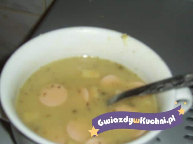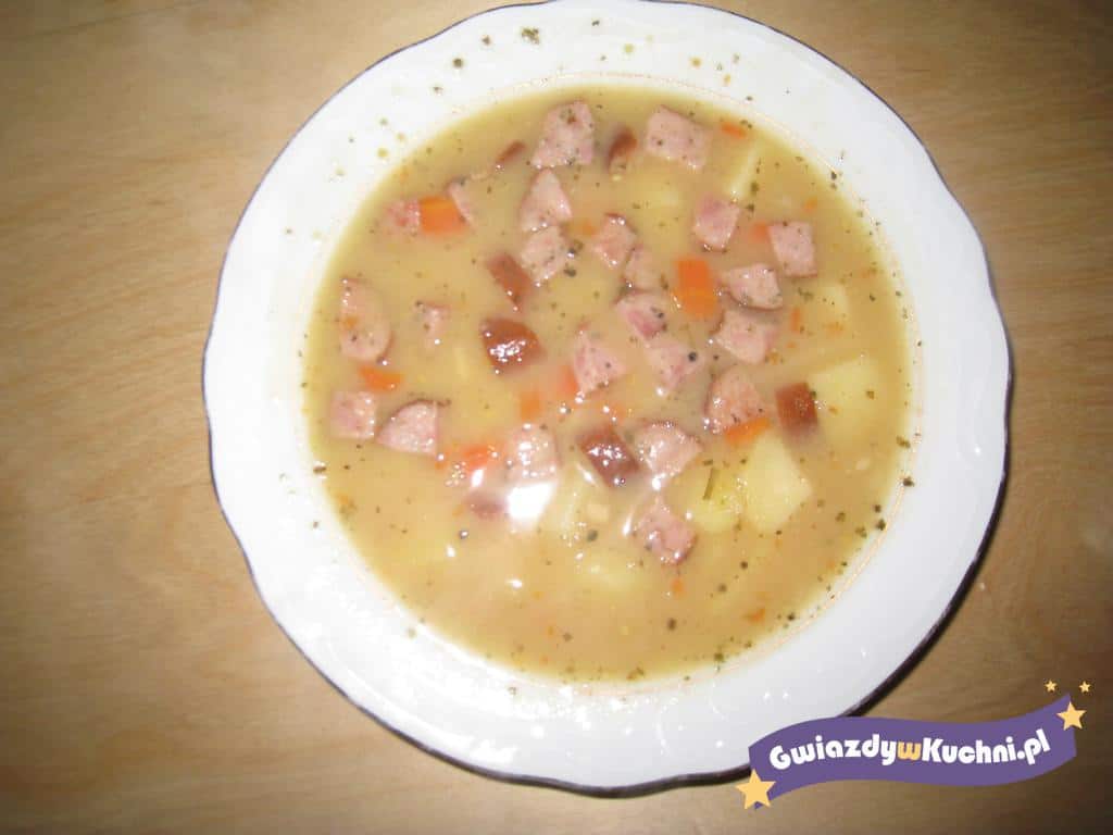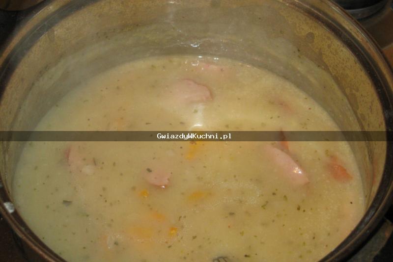 Groch namoczyć na noc, gotować 1 godzinę razem z boczkiem. Warzywa umyć, pokroić drobno, odłożyć 10 dag porów, resztę włożyć do gotującej się zupy, gotować 30 minut. Wyjąć mięso i boczek, warzywa odcedzić, dodać szklankę mleka, pokrojone liście selera, resztę porów, pokrojony boczek i kiełbasę, gotować 5-10 min. Podawać.