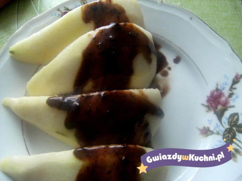 Wodę zagotować z cukrem i kwaskiem, włożyć obrane gruszki (wydrążyć je wcześniej). Gotować gruszki w syropie aż zmiękną, polać roztopioną czekoladą.