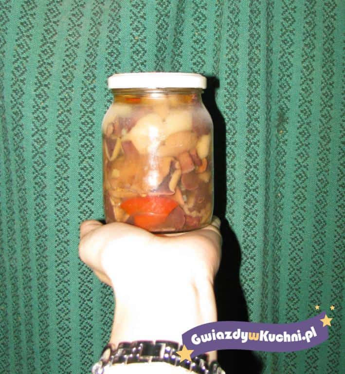 Zdrowe małe kapelusze sparzyć, a następnie wrzucić do lekko osolonego wrzątku, gotować przez 15-20 minut, przelać na sicie zimną wodą, osączyć. Cebulkę i czosnek obrać. Paprykę oczyścić z gniazd, pokroić w słupki, sparzyć i przelać zimną woda. Grzyby i warzywa ułożyć warstwami w słoikach.