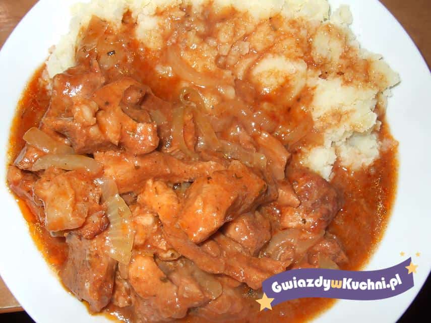 Mięso pokroić w średnią kostkę. Cebulę obrać i pokroić w grubsze plastry. Ziołą wymieszać w miseczce. Rękaw do pieczenia szczelnie zawiązać z jednej strony. Wrzucić do niego mięso, przyprawy i cebulę, ziele angielskie i liść laurowy. Ketchup wylać na mięso. Szczelnie zawiązać tak aby sos nie wyciekał. Delikatnie obracając woreczek rozprowadzić przyprawy i ketchup po całym mięsie. Wstawić do żaroodpornego naczynia i piec w piekarniku nagrzanym do 180 stopni przez 60 minut.