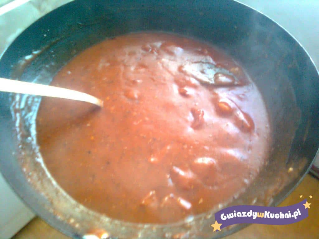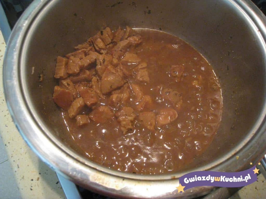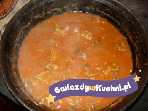 Gdy mięso jest miękkie dodać koncentrat pomidorowy i paprykę w proszku, wymieszać, zagotować.