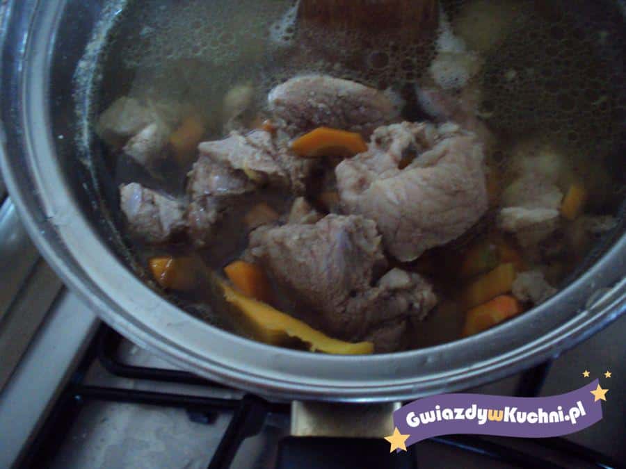 Mięso umyj, osusz, pokrój w kostkę i usmaż na oleju. Dodaj dashi, sake i białe części dymek, duś pod przykryciem 1,5 godziny. Dodaj cukier, gotuj jeszcze kwadrans pod przykryciem, aż będą lekko miękkie. Obrane marchewki pokrój w plasterki i ugotuj. Ugotowane marchewki i ziemniaki dodaj do gulaszu, gotuj razem 5 minut, dodaj sos sojowy, zagotuj wyjmij białe części dymek. Przed podaniem posyp całość posiekanym szczypiorem dymek.