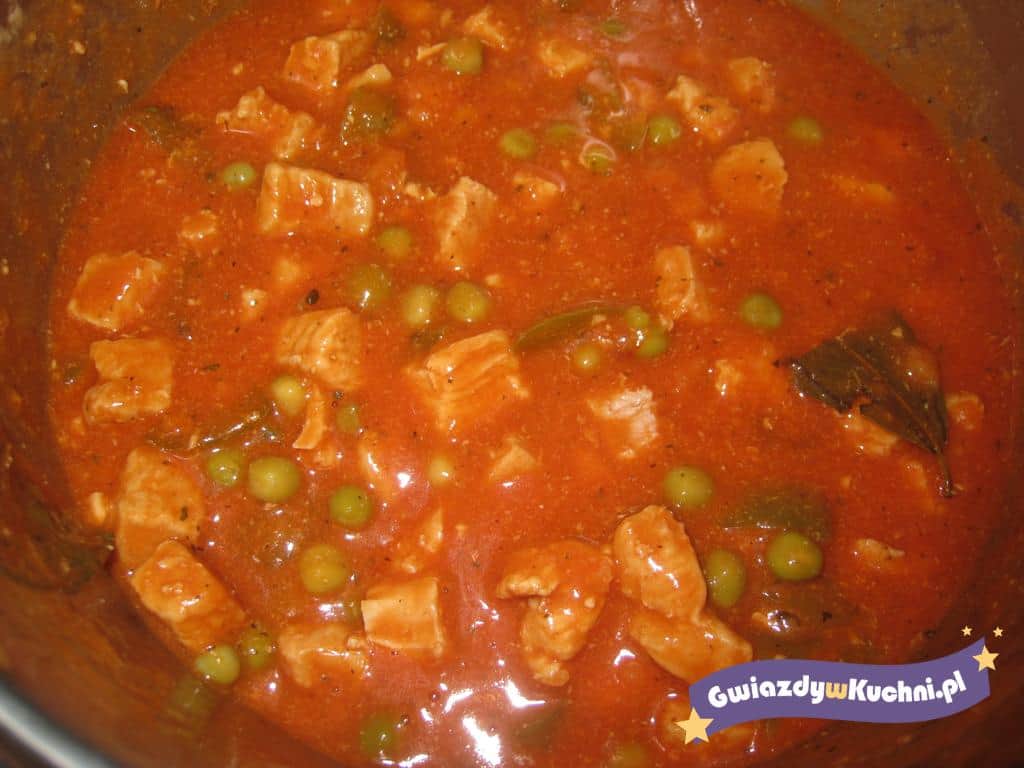 Mięso umyć, pokroić na duże kawałki. Cebulę drobno posiekać, usmażyć na oleju, dodać mięso, podsmażyć, dodać liście laurowe, bulion warzywny , przyprawy i dusić na małym ogniu pod przykryciem. Dusić wszystko do chwili, aż mięso będzie miękkie. Dodać na sam koniec groszek zielony i chwilkę poddusić.