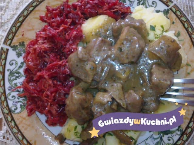 Mięso myjemy, osuszamy i kroimy w kostkę. Posypać solą, pieprzem i podsmażyć na rozgrzanym oleju rumiany kolor. Cebulę obrać pokroić w kostkę, dodać do mięsa i chwilkę podsmażać z mięsem. Zalać wodą, dodać suszone grzyby i dusić do miękkości mięsa (ok 35-40 minut). Pod koniec gotowania doprawić do smaku majerankiem i solą w razie potrzeby. Zagęścić mieszanką z wody i mąki. Podajemy z ziemniakami.