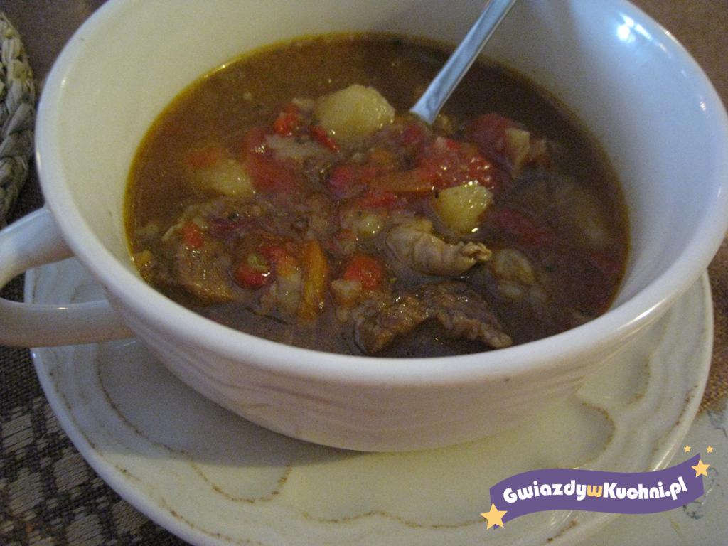 Mięso pokrój w średnią kostkę, przypraw solą pieprzem, obsmaż na oleju. Przełóż do garnka i zalej wodą, zagotuj. Dodaj liść laurowy, ziele angielskie i marchewkę pokrojoną w kostkę, ziemniaki, cebulę i paprykę. Kiedy warzywa będą prawie miękkie dodaj śmietanę koncentrat pomidorowy oraz zioła prowansalskie. Gotuj jeszcze 10 minut, ewentualnie dopraw do smaku.