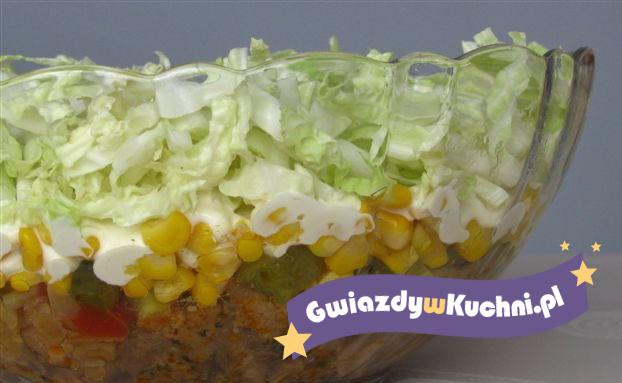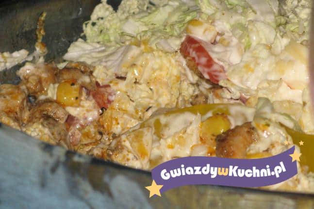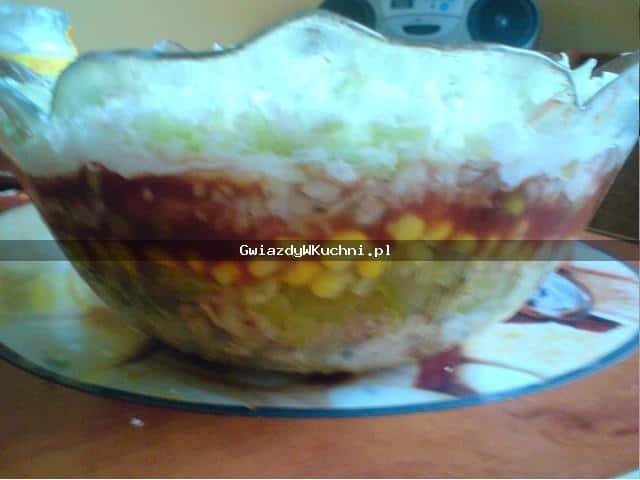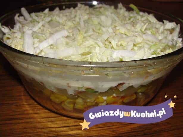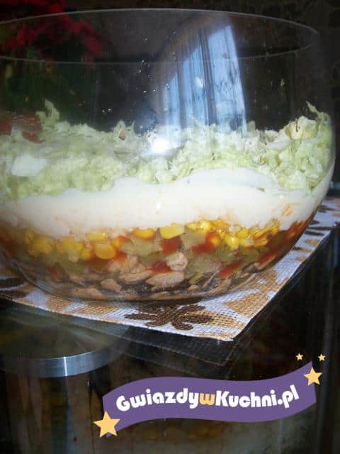 Kurczaka kroimy w kostkę posypujemy przyprawą gyros i podsmażamy kurczaka na złocisty kolor. Ogórka i pomidory kroimy w kostkę, porę w cienkie plasterki. Kapustę pekińską bardzo drobno szatkujemy. Na dnie najlepiej przezroczystej miski, układamy warstwowo: kurczak – rozsmarowujemy ketchupu, kukurydza, pora – majonez – ogórek kiszony – ketchupu, pomidor, kapusta pekińska i ostatnia warstwa majonezu.