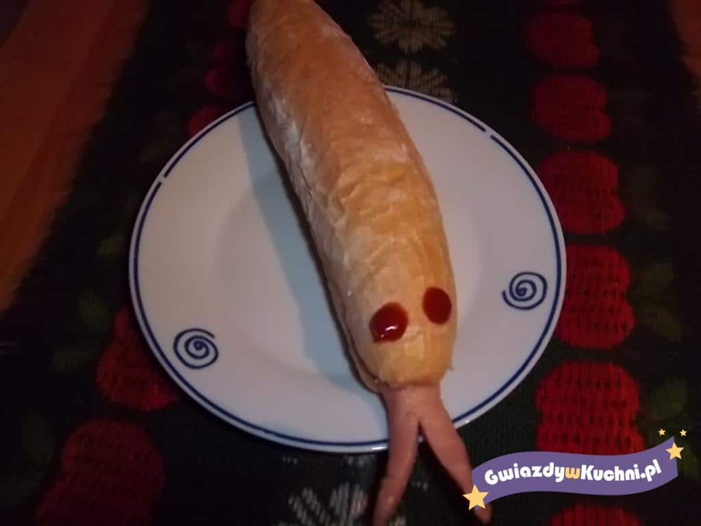 Parówki ugotuj. W sztanglach zrób otwory prawie przez całą długość tak aby nie przeciąć brzegów (po prostu dziury). Posmaruj lekko w środku masłem a następnie wlej do środkach trochę keczupu. Do tak przygotowanych sztangli włóż po parówce. Z czwartej parówki powycinaj języki węża i włóż do sztangli. Z keczupu zrób oczy. Gotowe węże hot dogi włóż na chwilę do mikrofali lub piekarnika.