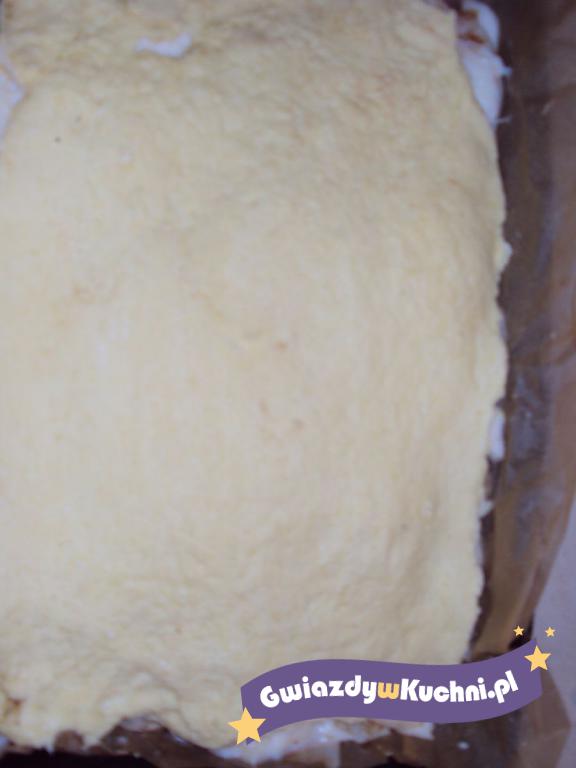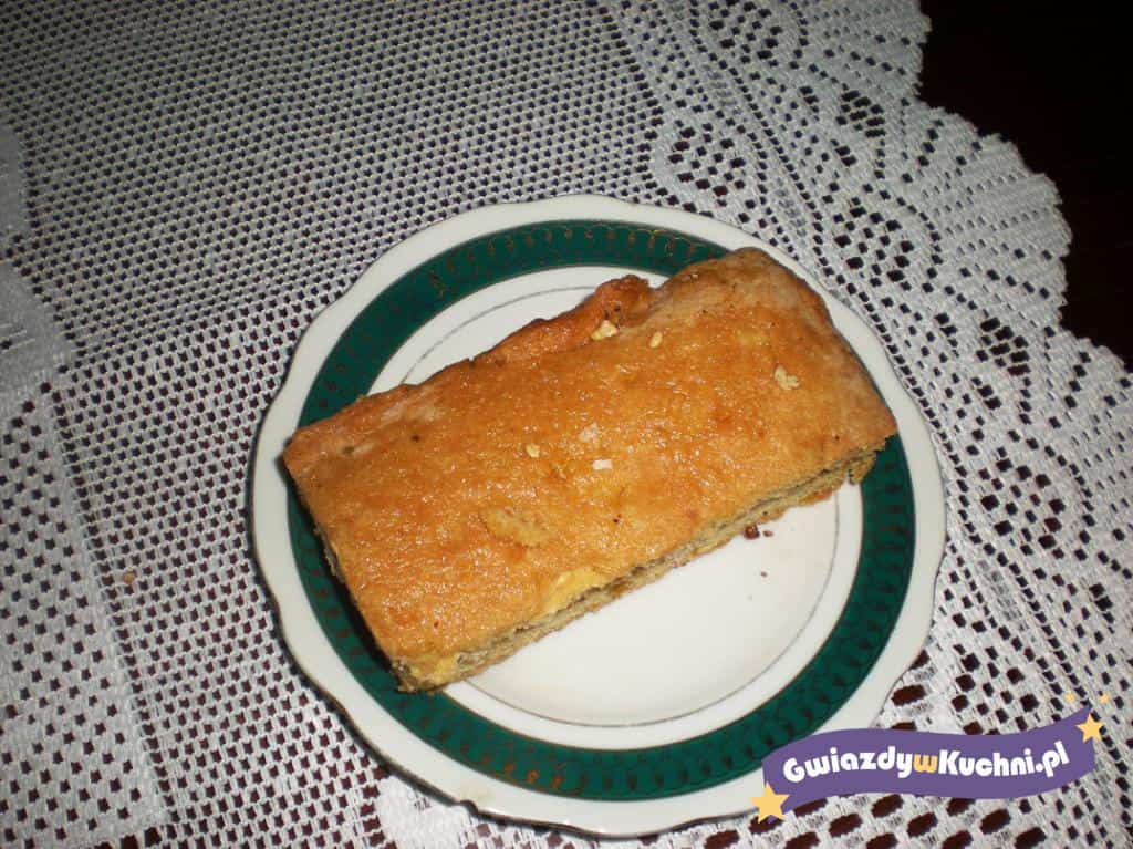 Mąkę należy wyrobić z cukrem, proszkiem do pieczenia, masłem, jajkami i zagnieść ciasto. Ciasto należy podzielić na dwie części. Blaszkę należy wysmarować masłem i wysypać mąką, przełożyć na nią 1/2 ciasta. Na cieście należy położyć obrane i pokrojone w plasterki jabłka, oprószyć je cukrem waniliowym oraz cynamonem. Przykryć drugą częścią ciasta. Ciasto należy piec około 45- 50 minut w piekarniku nagrzanym do 180 stopni.