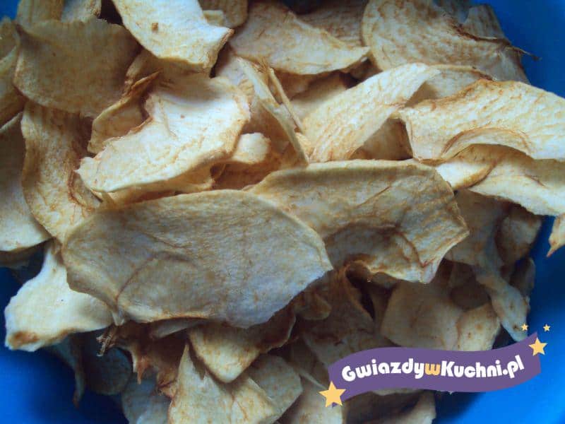 Jabłka obieramy, wyczyszczamy gniazda, kroimy w ósemki. Następnie wodę mieszamy z kwaskiem cytrynowym. Wkładamy na 5 minut jabłka. Następnie nakładamy na nitkę jabłka. Pozostawiamy w ciepłym miejscu do suszenia.