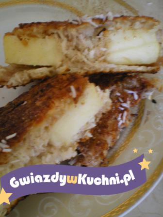 Jajka roztrzepać z mlekiem. Dodać mąkę z proszkiem. Zmiksować na jednolite, gładkie ciasto. Jabłka obrać, wykroić gniazda nasienne, pokroić na grube plastry. Każdy z jabłkowych plastrów obtaczać w cynamonie wymieszanym z cukrem, po czym zanurzać w cieście naleśnikowym, a potem panierować w kokosie. Na patelni rozgrzać olej, smażyć na nim jabłuszka w cieście. Uważać, bo szybko się przypala. Zalecam smażenie na małym ogniu. Osączać z nadmiaru tłuszczu na papierowym ręczniku.