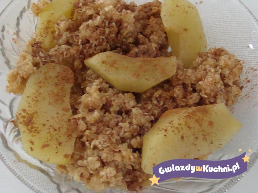 Na patelni rozpuścić masło, dodać miód i płatki owsiane. Smażyć, aż płatki staną się chrupkie. Jabłka umyć, pokroić w półksiężyce i poddusić na wodzie (na osobnej patelni) do miękkości. Gotowe dodać do płatków, posypać cynamonem i wymieszać