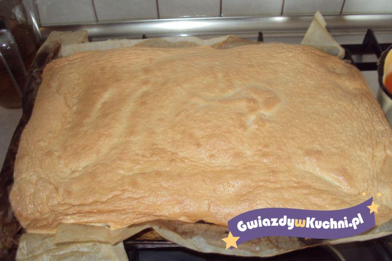 Jabłka myjemy, obieramy, ścieramy na tartce o grubych oczkach, dodajemy do startych jabłek cynamon, mieszamy. Margarynę, żółtka, cukier, mąkę i proszek do pieczenia łączymy ze sobą, wyrabiamy kruche ciasto, wkładamy do lodówki na godzinkę. Wyjmujemy z lodówki rozwałkowujemy, wykładamy do blaszki, na ciasto układamy jabłka. Pianę ubijamy z mąką ziemniaczaną, polewamy po jabłkach. Pieczemy 45 minut w 180 stopniach.