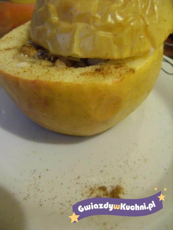 Farszem wype艂ni膰 jab艂ka. Przykry膰 wcze艣niej odci臋tymi plastrami. Owin膮膰 jab艂ka w foli臋 aluminiow膮, w艂o偶y膰 do formy, wstawi膰 do piekarnika (na 25-30 minut; temp. 190- 200 st C).