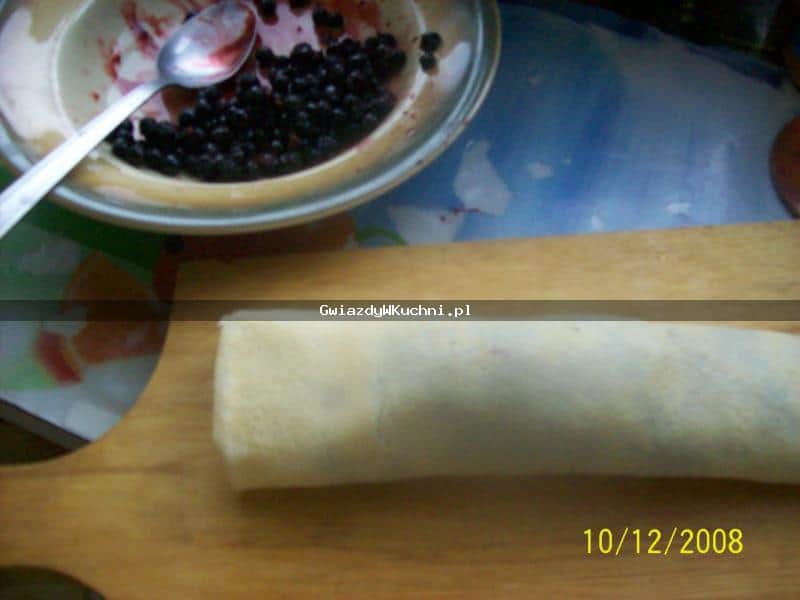Z jajek, mleka, wody, mąki, soli i cukru ubić gładkie ciasto. Patelnię mocno nagrzać, smarować skórką od słoniny, smażyć cienkie placki, układać na talerzu. Na każdy naleśnik nałożyć łyżkę jagód, zawinąć w kopertę. Na patelni rozgrzać olej, ułożyć naleśniki, obsmażyć na złoty kolor. Podawać posypane cukrem pudrem.