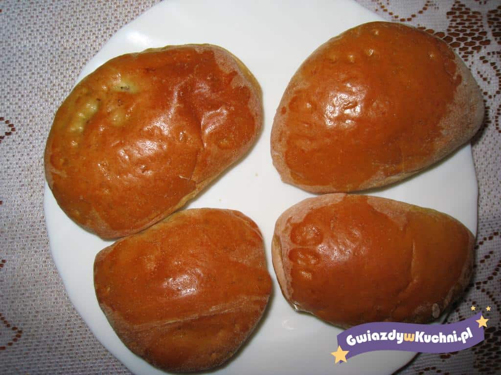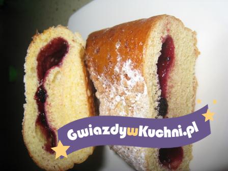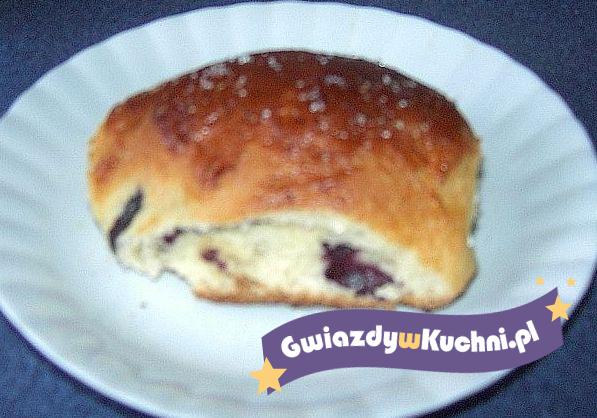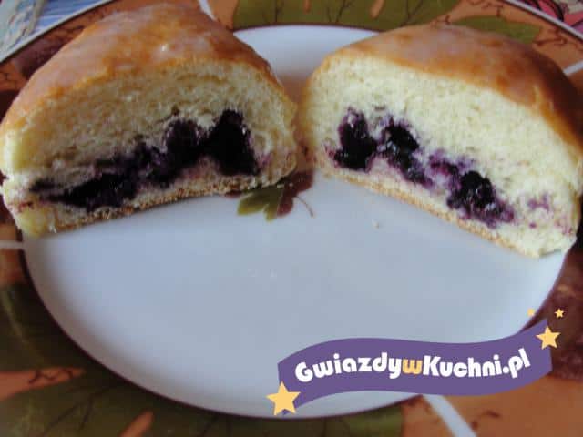 Drożdże rozpuścić w ciepłym mleku, dokładnie rozmieszać. Wymieszać z łyżką mąki i cukru i zaczyn odstawić do wyrośnięcia na ok. 20 minut. W tym czasie jajka utrzeć z resztą cukru, połączyć z zaczynem oraz resztą mąki, a także dodać cukier waniliowy. Wyrobić ciasto, a na koniec dodać rozpuszczone wcześniej i wystudzone masło. Odstawić na 30 minut do wyrośnięcia. Następnie z ciasta uformować wałek i pokroić na niewielkie krążki, które delikatnie spłaszczyć. Na środku każdego z nich ułożyć po łyżce umytych i wymieszanych z cukrem pudrem jagód. Każdą z nich posmarować rozmąconym żółtkiem wymieszanym z niewielką ilością wody. Zlepić bułeczki i piec je w nagranym do 180 stopniu stopni piekarniku przez ok. 20 – 25 minut. Podawać posypane cukrem pudrem.
