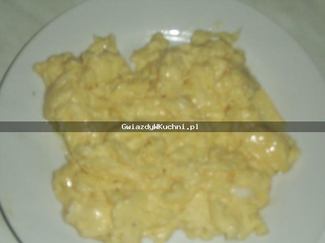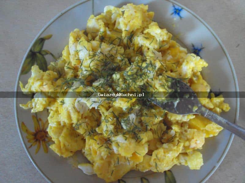 Jajka rozbijamy mikserem w misce. Dodajemy mleko i miksujemy na najwyższych obrotach. Następnie dodajemy sól i pieprz do smaku. Masełko rozgrzewamy na patelni i na rozgrzane wlewamy jajka zmiksowane. Mocno niewysmażać. Na koniec posypać posiekanym koperkiem.