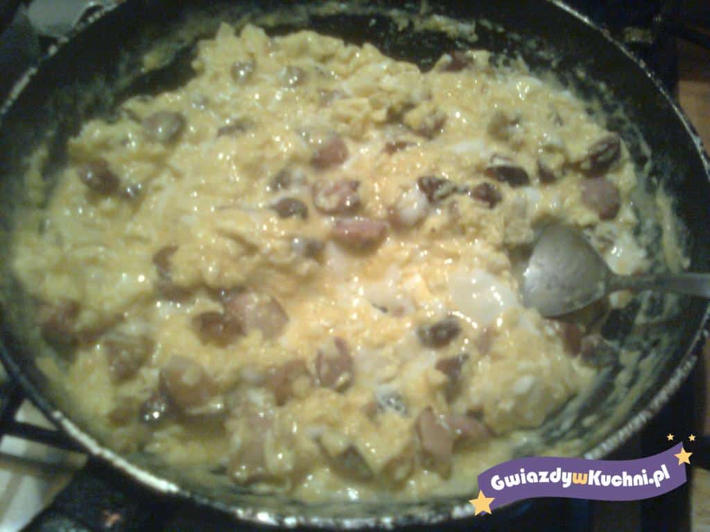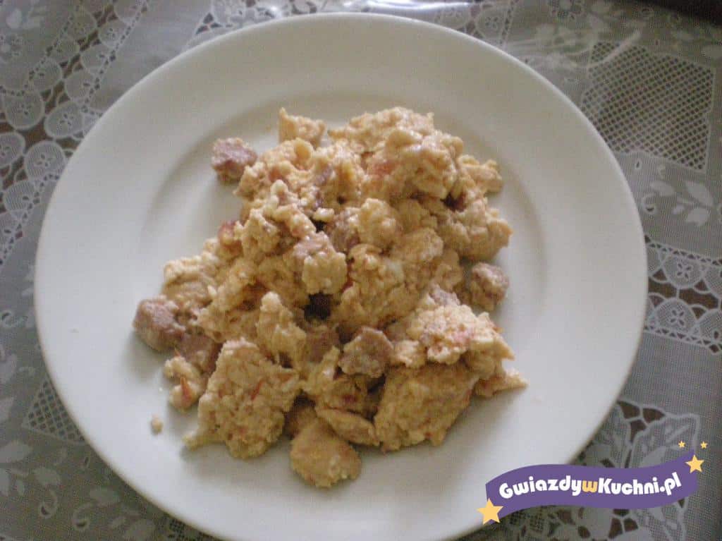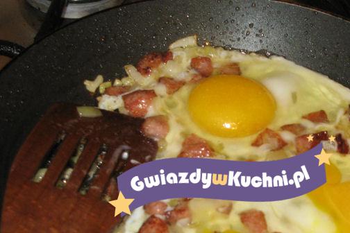 Jajka rozmącić w misce z solą i wlać na podsmażoną kiełbaskę, mieszać aż jajka się zetną.