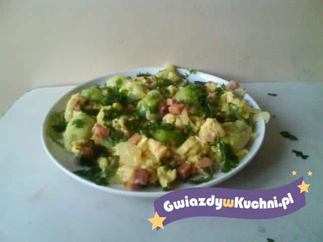 Brukselkę ugotować w osolonej wodzie z dodatkiem cukru, odcedzić i pokroić na pół. Jajka rozbełtać, doprawić pieprzem i solą. Cebulę obrać, pokroić w piórka. Kiełbasę pokroić w kostkę. Na rozgrzanym oleju podsmażyć cebulę i kiełbasę, dodać brukselkę i drobno posiekany czosnek, jeszcze chwilę podsmażyć. Dodać rozbełtane jajka i mieszać, aż się zetną. Wyłożyć na talerz i posypać posiekaną natką pietruszki.