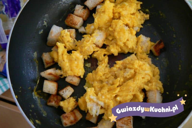 Chleb kroimy w kostkę i smażymy na maśle na patelni, żeby powstały grzanki. W kubku rozbijamy jajka z magą i mlekiem. Zalewamy grzanki i mieszamy. Gotowe